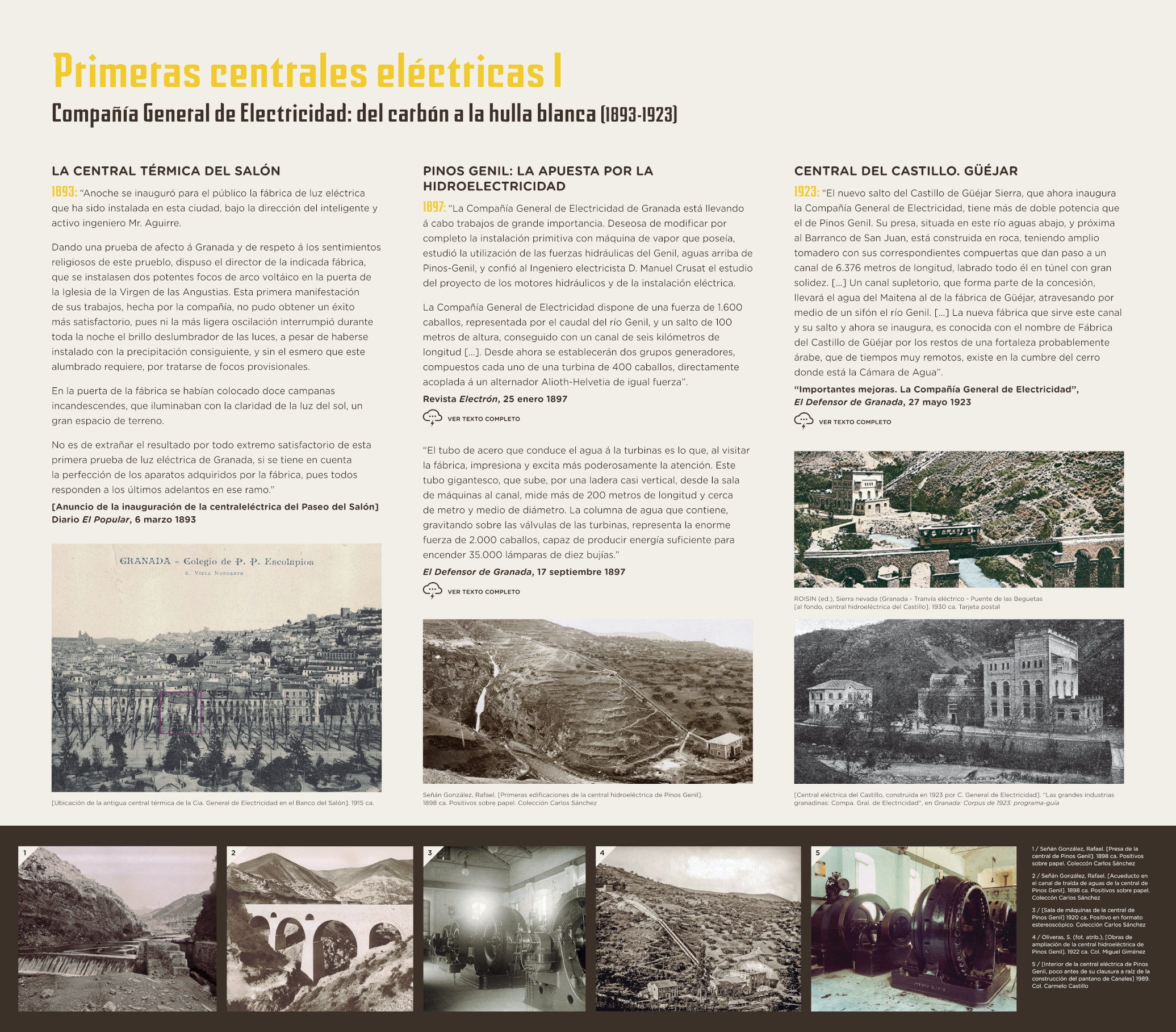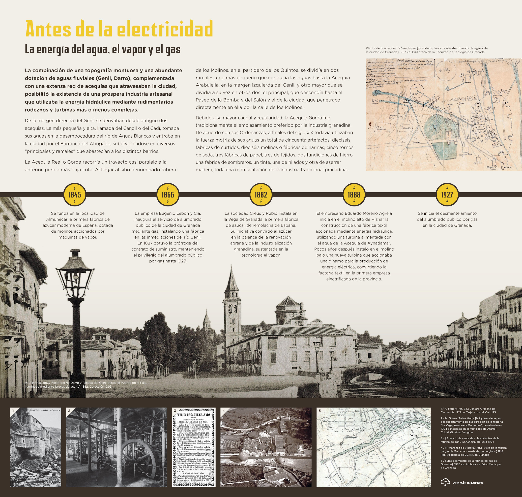 La exposición La energía hidroeléctrica en la provincia de Granada aborda una de las manifestaciones más contemporáneas en el uso tradicional de los recursos hidráulicos, como fue y es la obtención de energía eléctrica. Pretende contribuir a rescatar una pequeña fracción de esa memoria que nos ha dejado el legado del agua, manifiesta en los molinos del Marqués y de Ganivet –donde se ubica la exposición– y una pequeña selección de la magnífica colección tecnológica que a lo largo de los años ha ido reuniendo el ingeniero Miguel Giménez Yanguas.