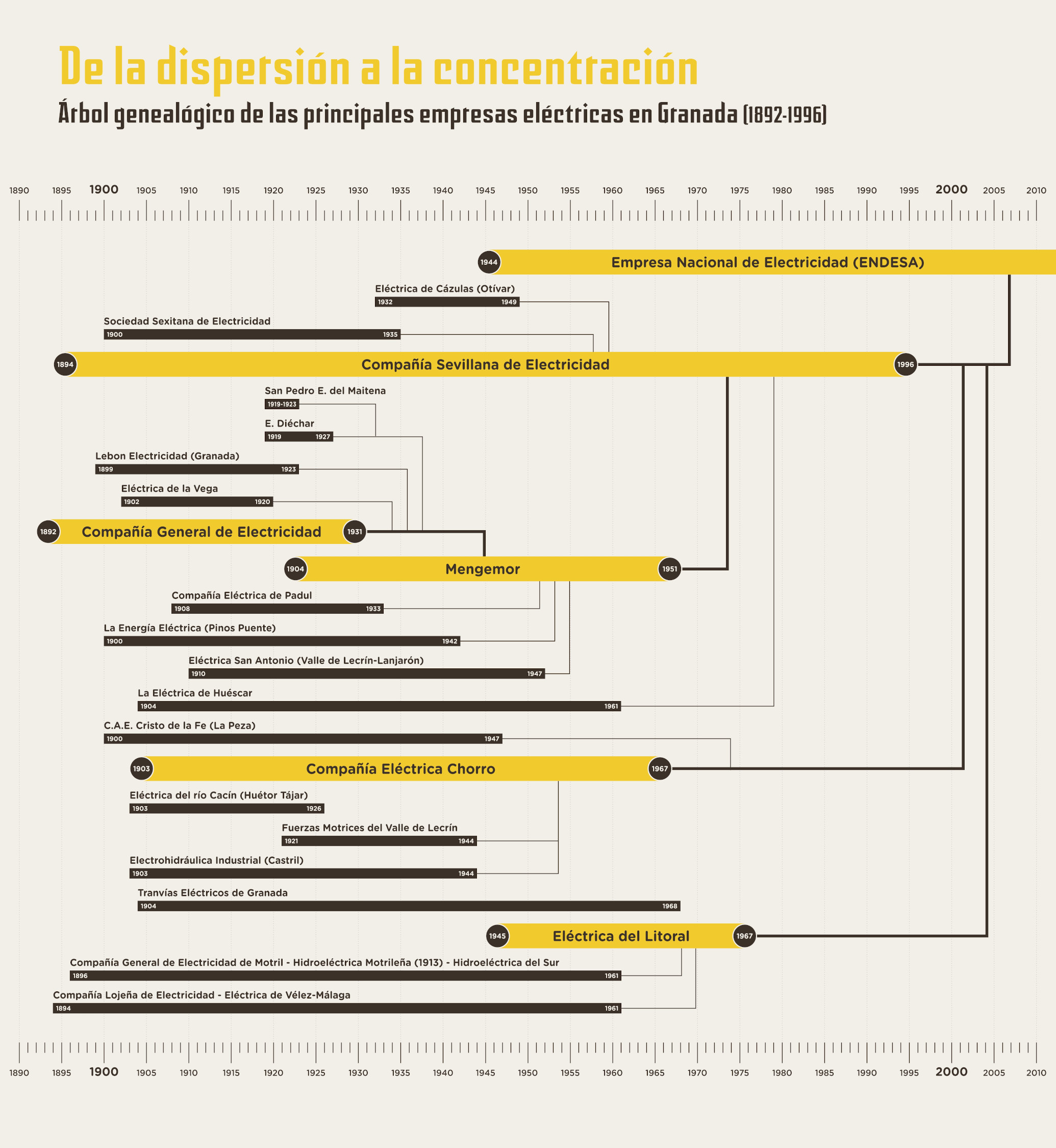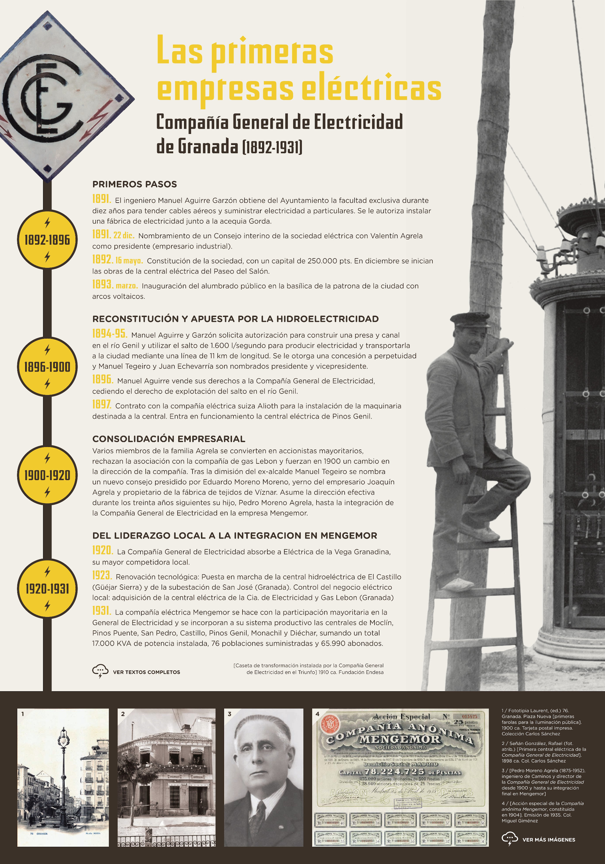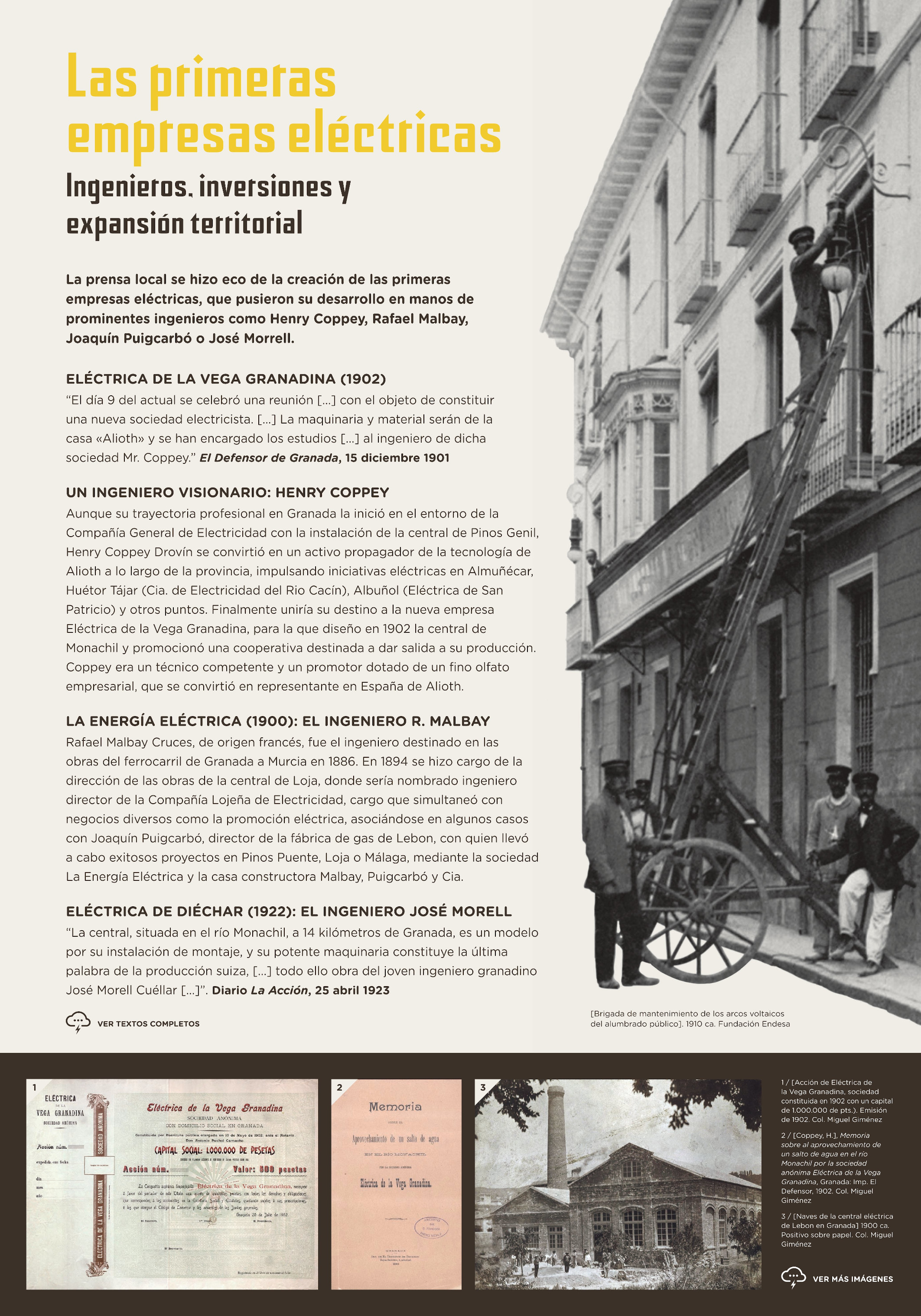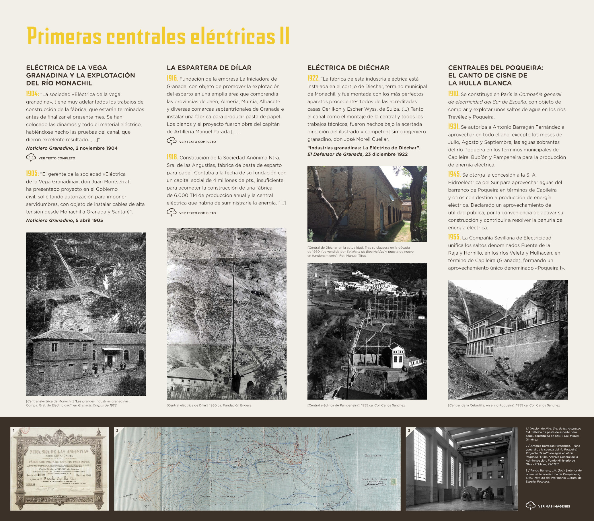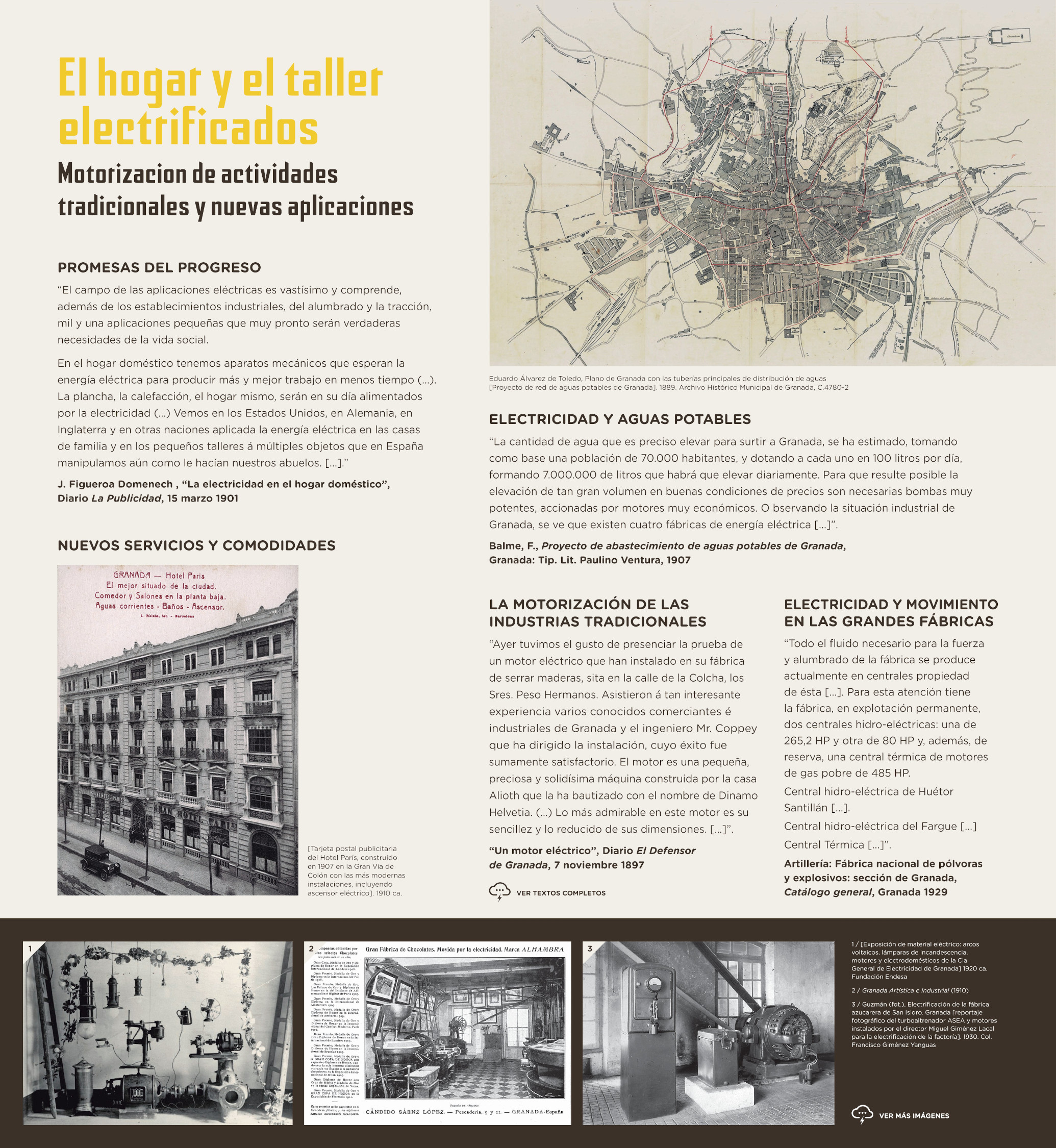 Muchas de las transformaciones sobrevenidas se apoyaron en la oleada de innovaciones propias de la denominada “segunda revolución tecnológica”, que constituye el sustrato sobre el que se edificó la aventura de la electrificación local entre las décadas de 1890 y 1950. Es este el escenario temporal elegido para esta exposición, que habla de electricidad y del agua para producirla, pero no solo de ellas. Porque esta novedad tecnológica se insertó en un ciclo de crecimiento y dinamismo económico global que transformó profundamente los modos de vida de sus habitantes.