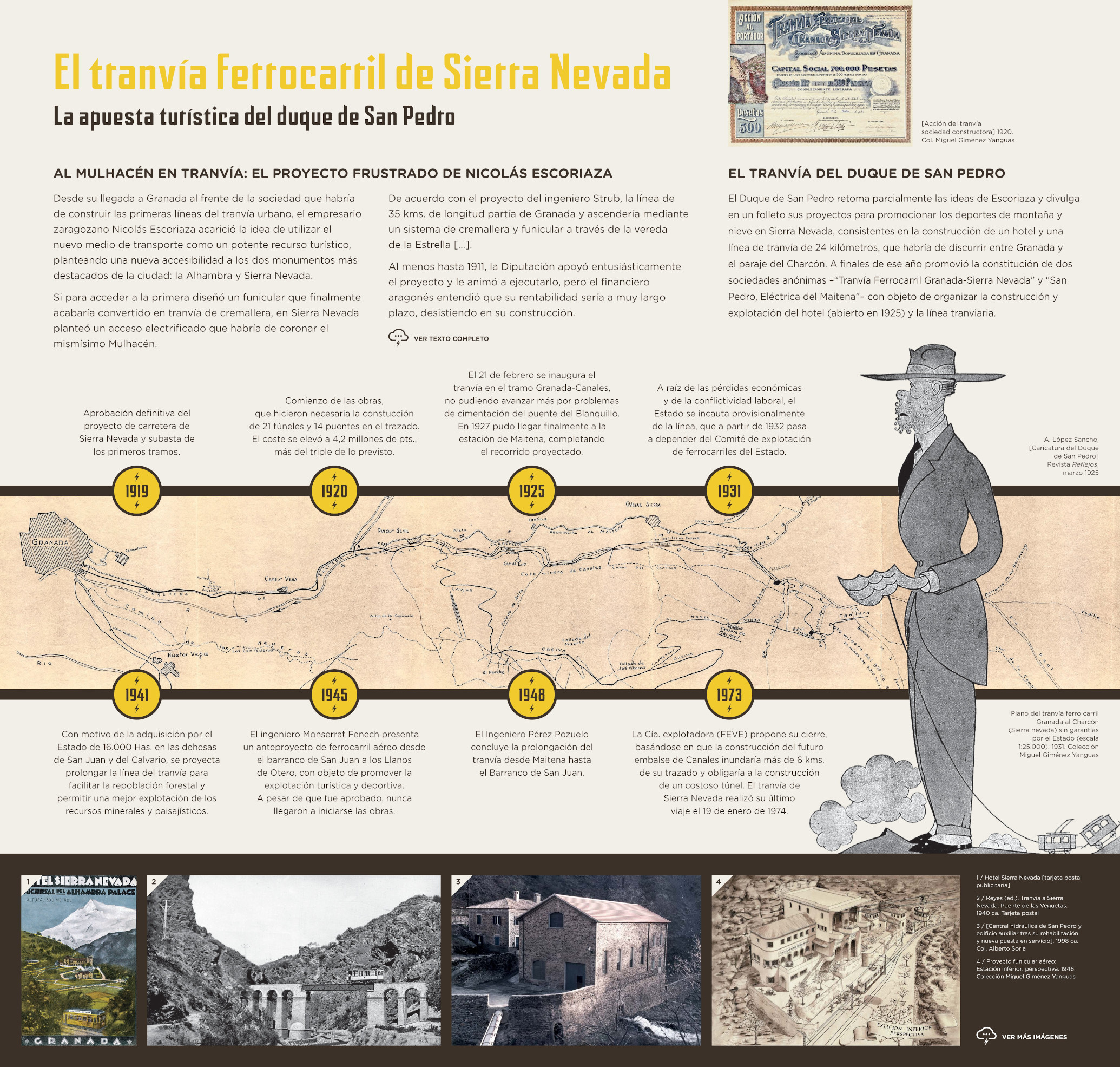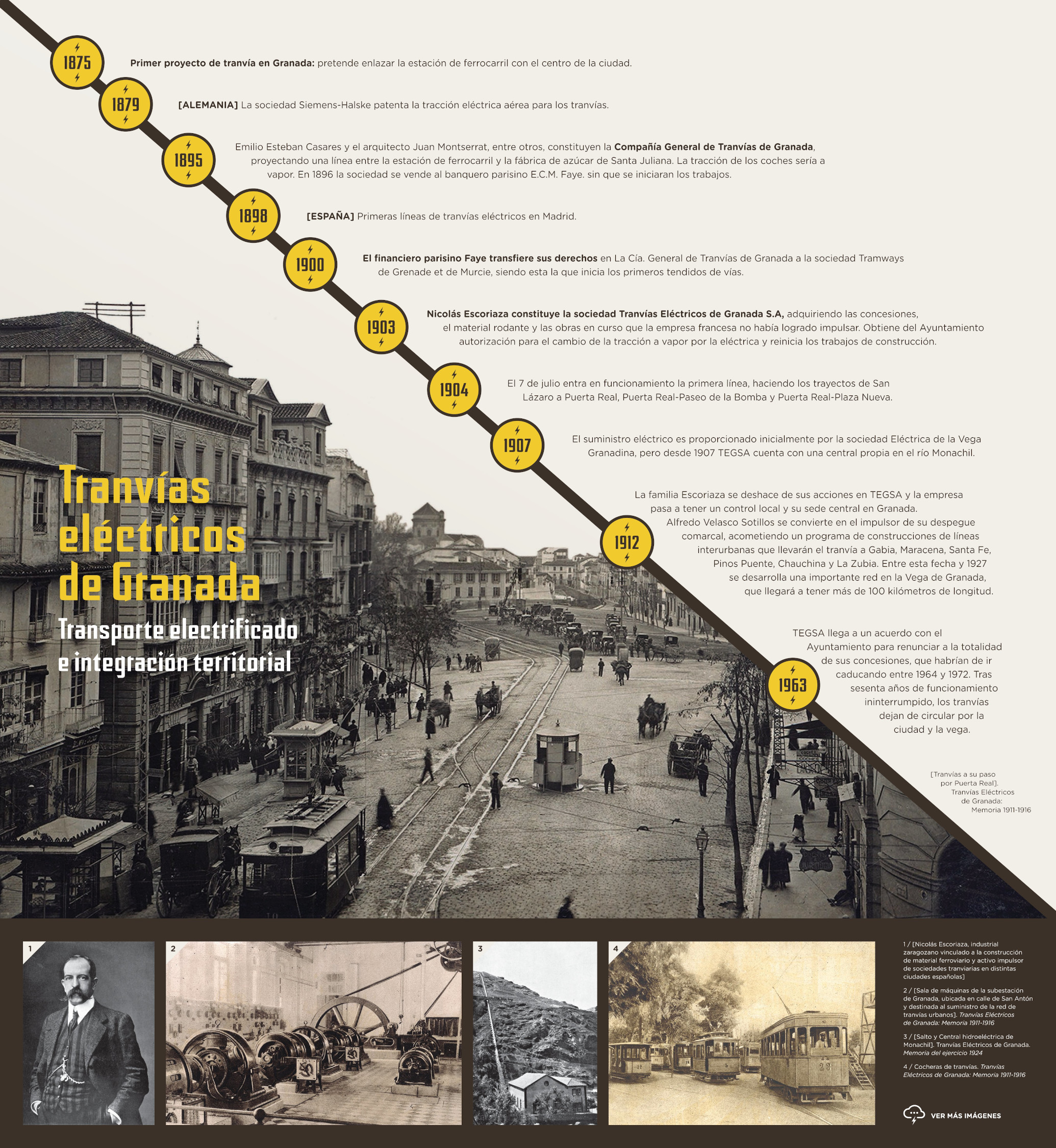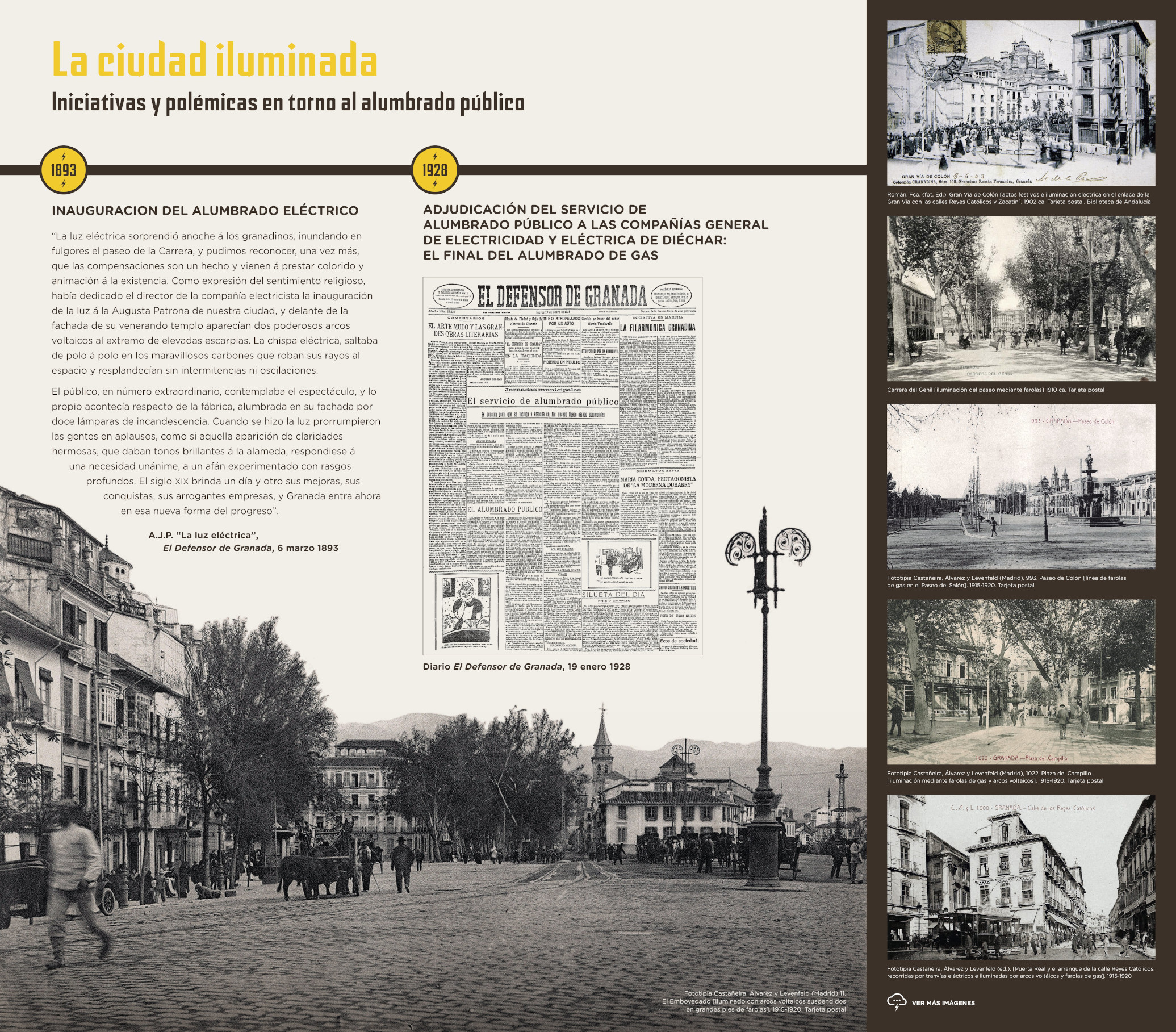 Granada inició el siglo XX con un perfil de modernidad que unas décadas atrás hubiera sido difícil imaginar. Ya fuera por adaptación a los cambios globales que se estaban produciendo en el país, ya por la aparición de oportunidades de crecimiento de raíz más local, la ciudad y la provincia parecían despertar de un letargo secular. Fueron años en los que se plantearon y ejecutaron, con mayor o menor fortuna y profundidad, actuaciones que dinamizarían la explotación del territorio y sus recursos y situarían a Granada en una senda de progreso económico y social.