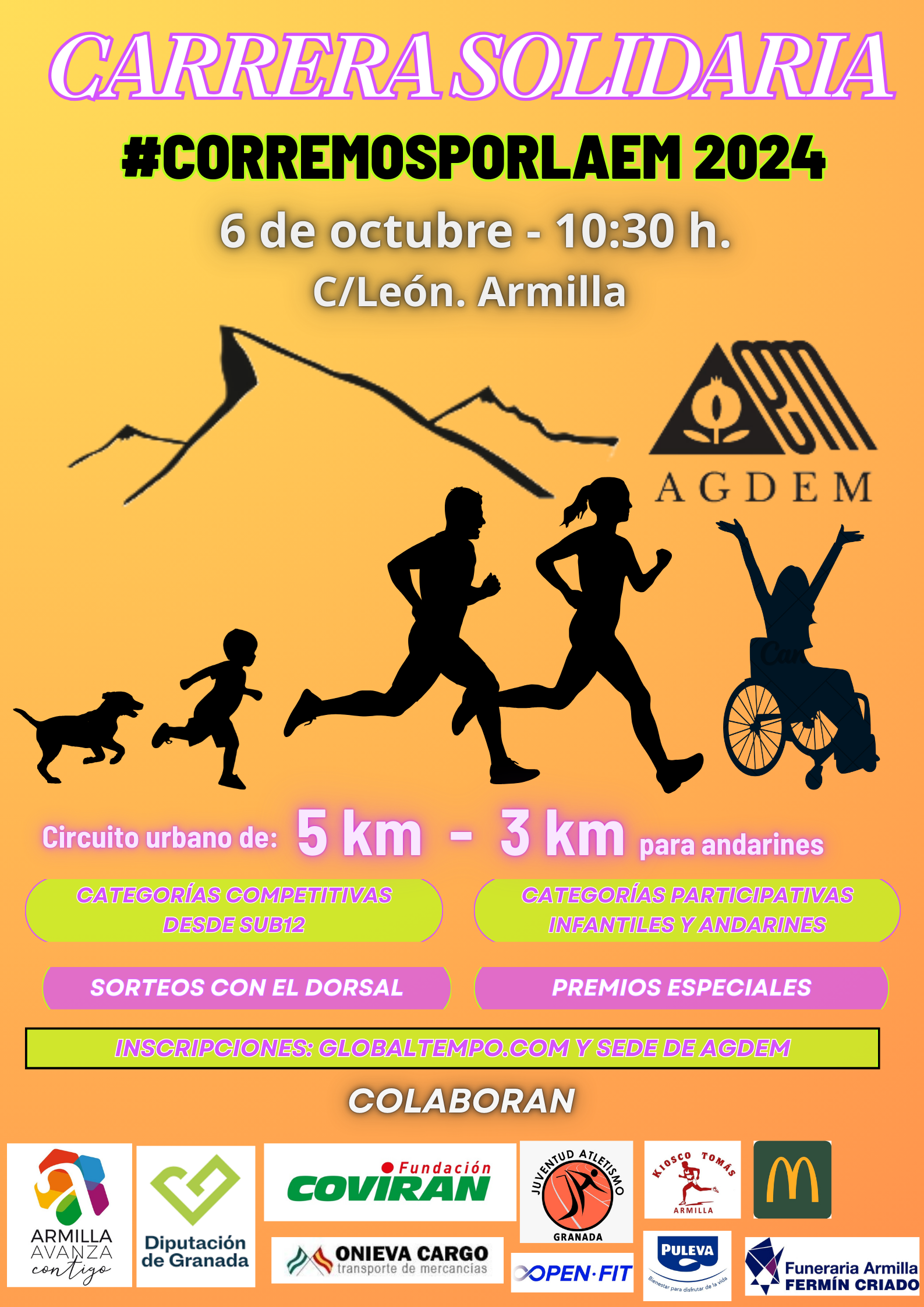 La Carrera Solidaria #CorremosporlaEM 2024 está promovida y organizada por la Asociación Granadina de Esclerosis Múltiple (AGDEM) con la colaboración del Ayuntamiento de Armilla y la Delegación de Deportes e Instalaciones Deportivas d ela Diputación de Granada, ya que parte del recorrido transcurre por las instalaciones de la Ciudad Deportiva.