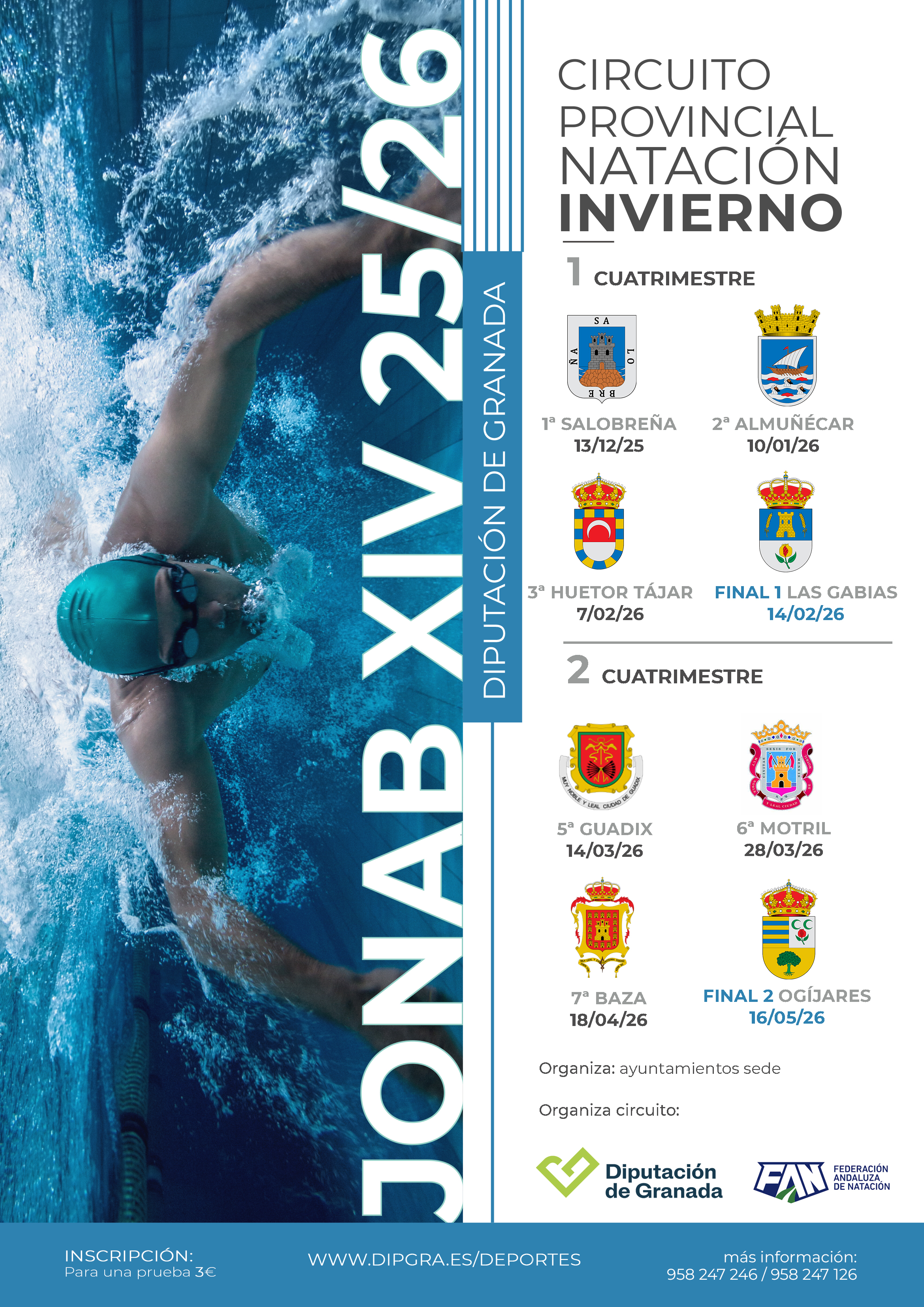 La delegación de deportes de la Diputación de Granada junto con los Ayuntamientos sedes, organizan una nueva edición de estas jornadas de natación base. Las sedes de este circuito serán: Salobreña, Almuñecar, Huétor Tajar, Baza, Guadix, Motril, Las Gabias y Ogíjares.