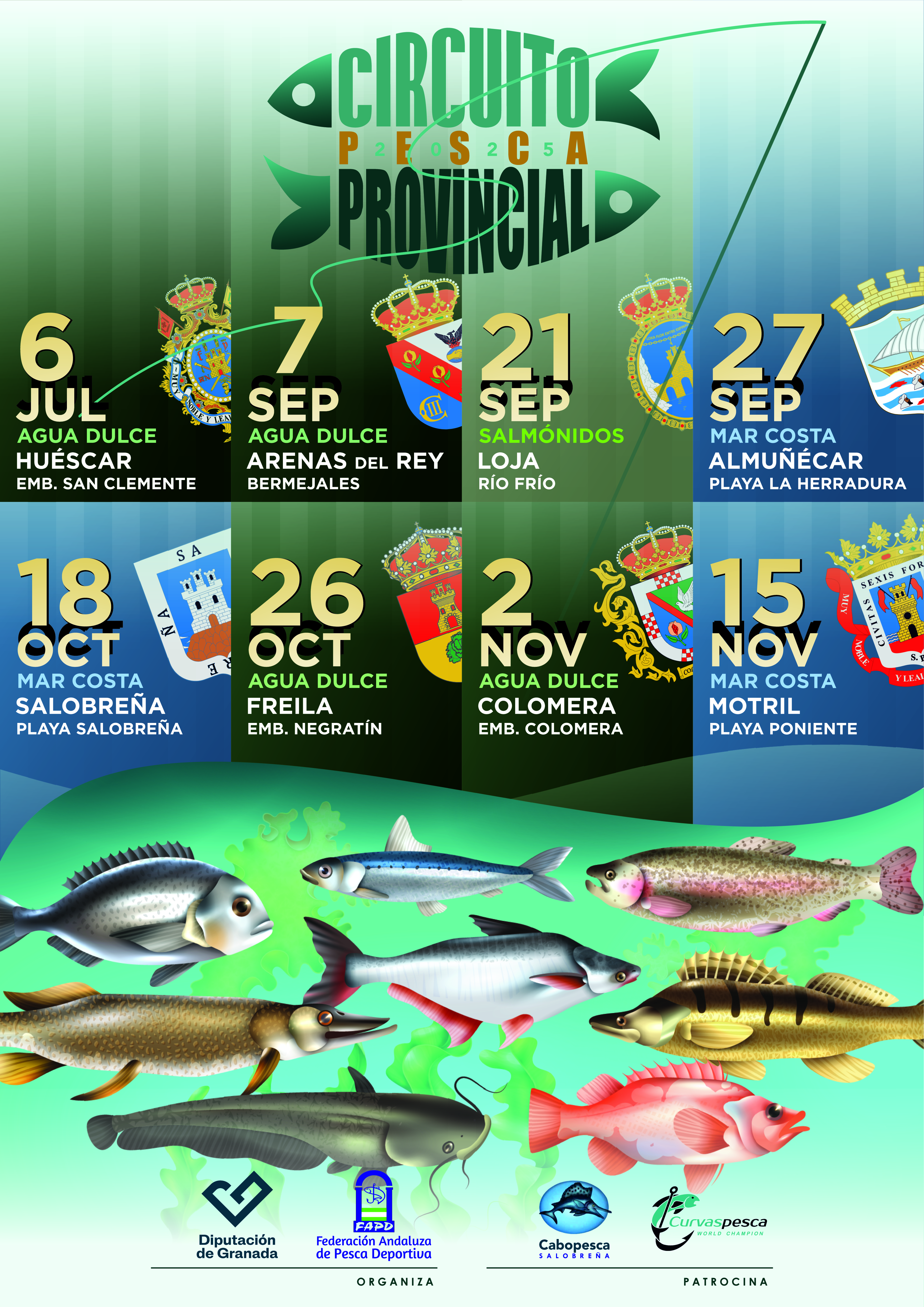 La Federación Andaluza de Pesca junto a la Delegación Territorial de Granada y los Ayuntamientos sede y con la colaboración de la Diputación de Granada, convocan el Circuito Provincial de Pesca Diputación de Granada.
