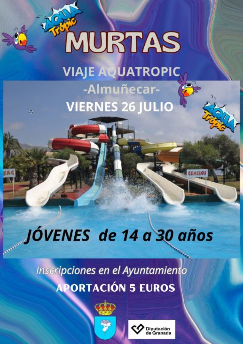 Se va a celebrar el 26 de julio de 2024 un viaje a AQUATROPIC de Almuñecar, para los jóvenes de 14 a 30 años, en horario de 10:00 h de todo el dia, INSCRIPCIONES EN EL AYUNTAMIENTO DE MURTAS y con aportación individual de 5 €.