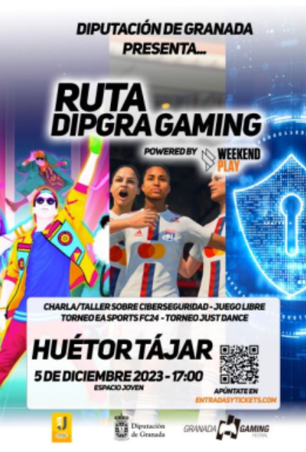 "¡Llega a Huétor Tájar, la Ruta Gaming de Diputación de Granada! No te pierdas una jornada donde hablaremos de ciberseguridad y jugaremos a FC24 y Just Dance. ¿Te harás con la victoria?