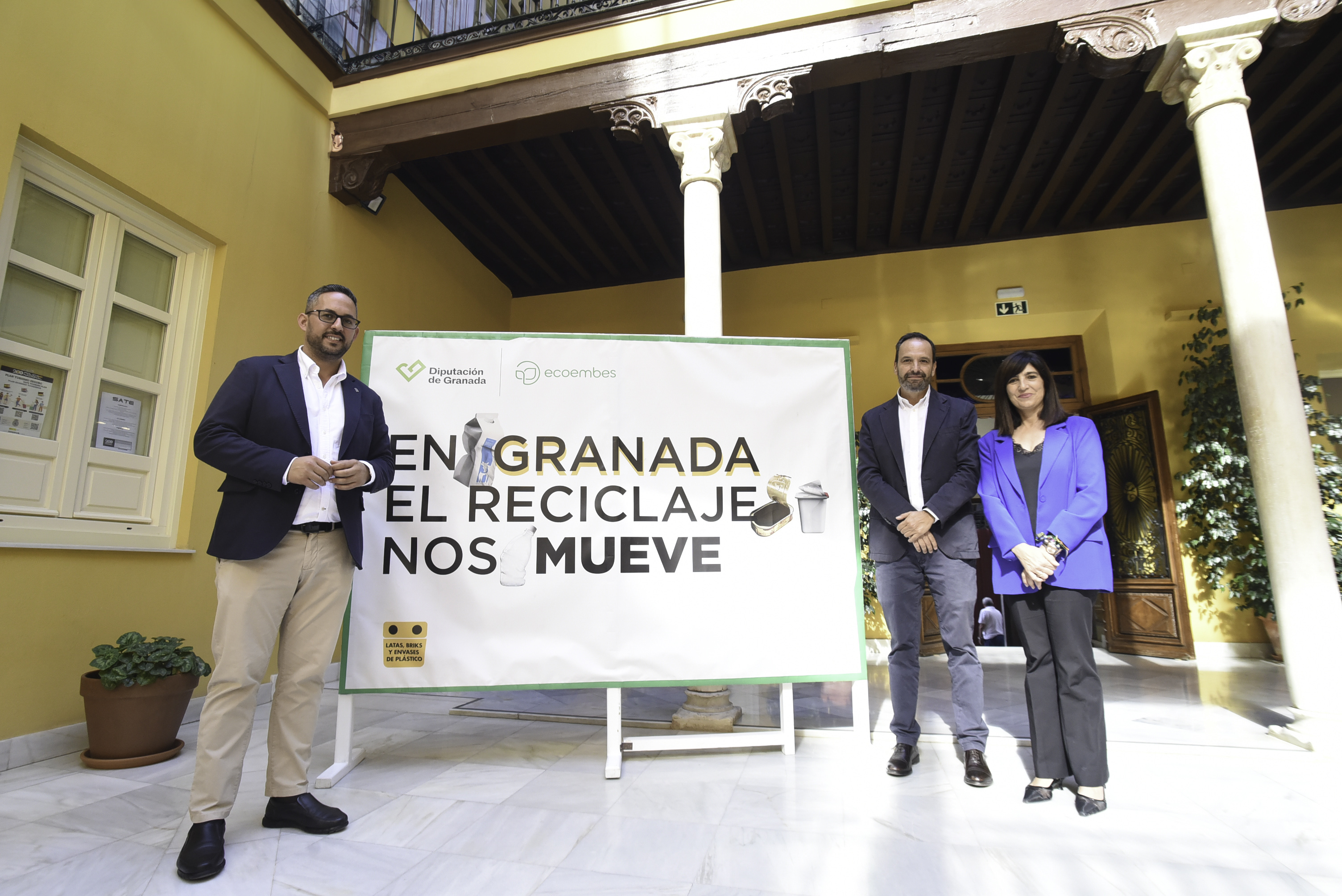 El diputado de Agua, Promoción Agraria y Medio Ambiente, Antonio Mancilla, la diputada de Cultura y Educación, Pilar Caracuel, y el gerente de Ecoembes en Andalucía, Antonio López, han presentado la campaña “En Granada, el reciclaje nos mueve”, que tiene como objetivo continuar concienciando a los vecinos de la provincia sobre la importancia de la separación de los residuos en origen. Esta iniciativa se centra principalmente en los envases de plástico, latas y briks, que han de ser depositados en el contenedor amarillo. Los importantes retos de reciclaje marcados para los municipios por la nueva Ley de residuos solo podrán lograrse con un aumento drástico de la recogida selectiva en los pueblos de la provincia.