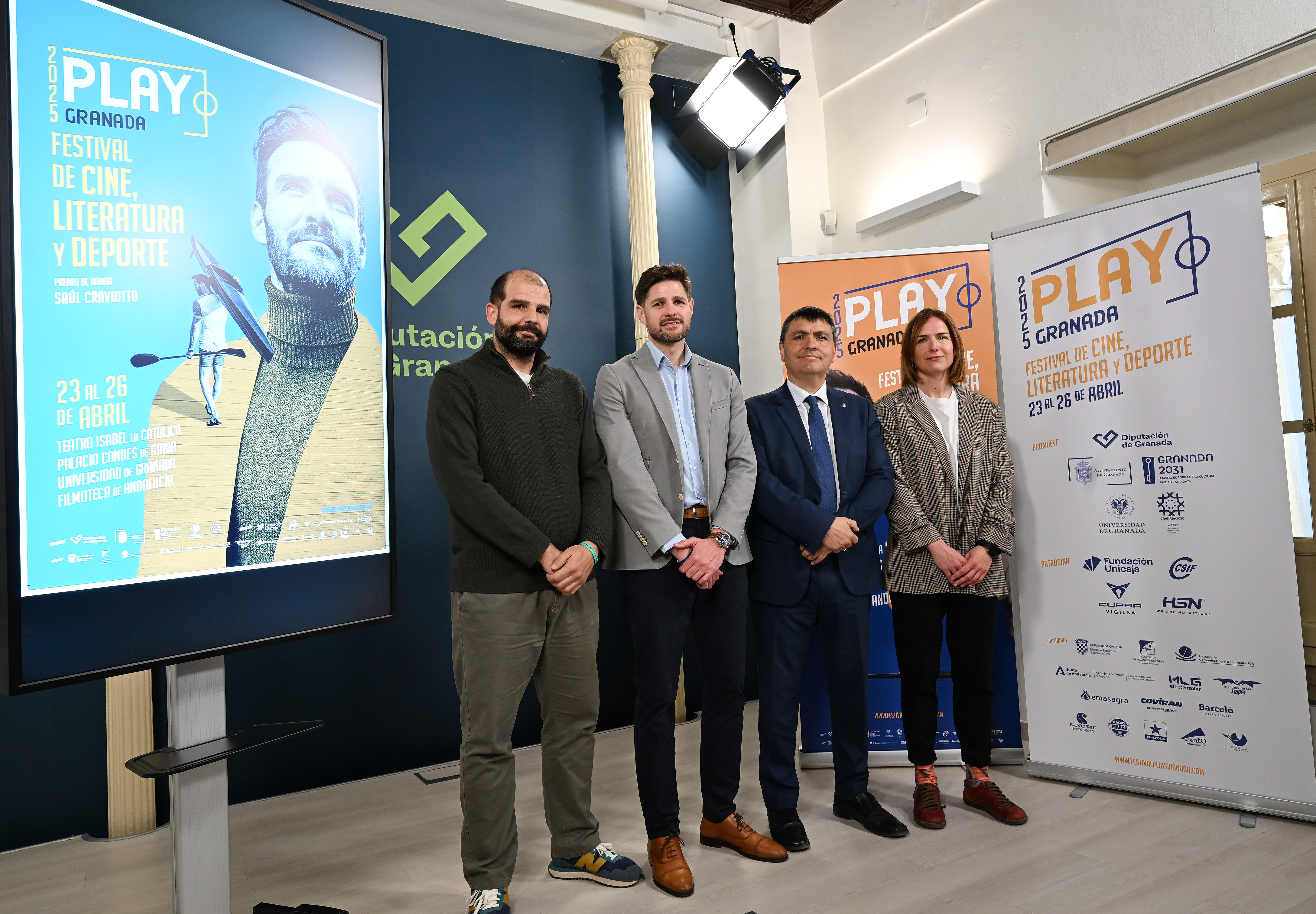 El diputado de Deportes e Instalaciones Deportivas, Eric Escobedo, junto al periodista y organizador del evento, José Manuel Puertas, el concejal de Deportes del Ayuntamiento de Granada, Jorge Iglesias, y la árbitra internacional de Rugby Alhambra Nievas, ha presentado Play Granada, el I Festival de Cine, Literatura y Deporte que se celebrará del 23 al 26 de abril en Granada, con el objetivo de acercar los valores del deporte a la ciudadanía, especialmente a la juventud. El Premio de Honor ‘Toño Santos’, que sirve como homenaje a la trayectoria vital y profesional de personas que unen los valores del deporte y la cultura, se entregará en esta primera edición a Saúl Craviotto. Este festival surge en el marco de la candidatura de Granada como Capital Europea de la Cultura 2031, y pretende posicionar a la ciudad y la provincia como referente cultural y deportivo, con proyecciones, conferencias, presentaciones de libros y actividades formativas.