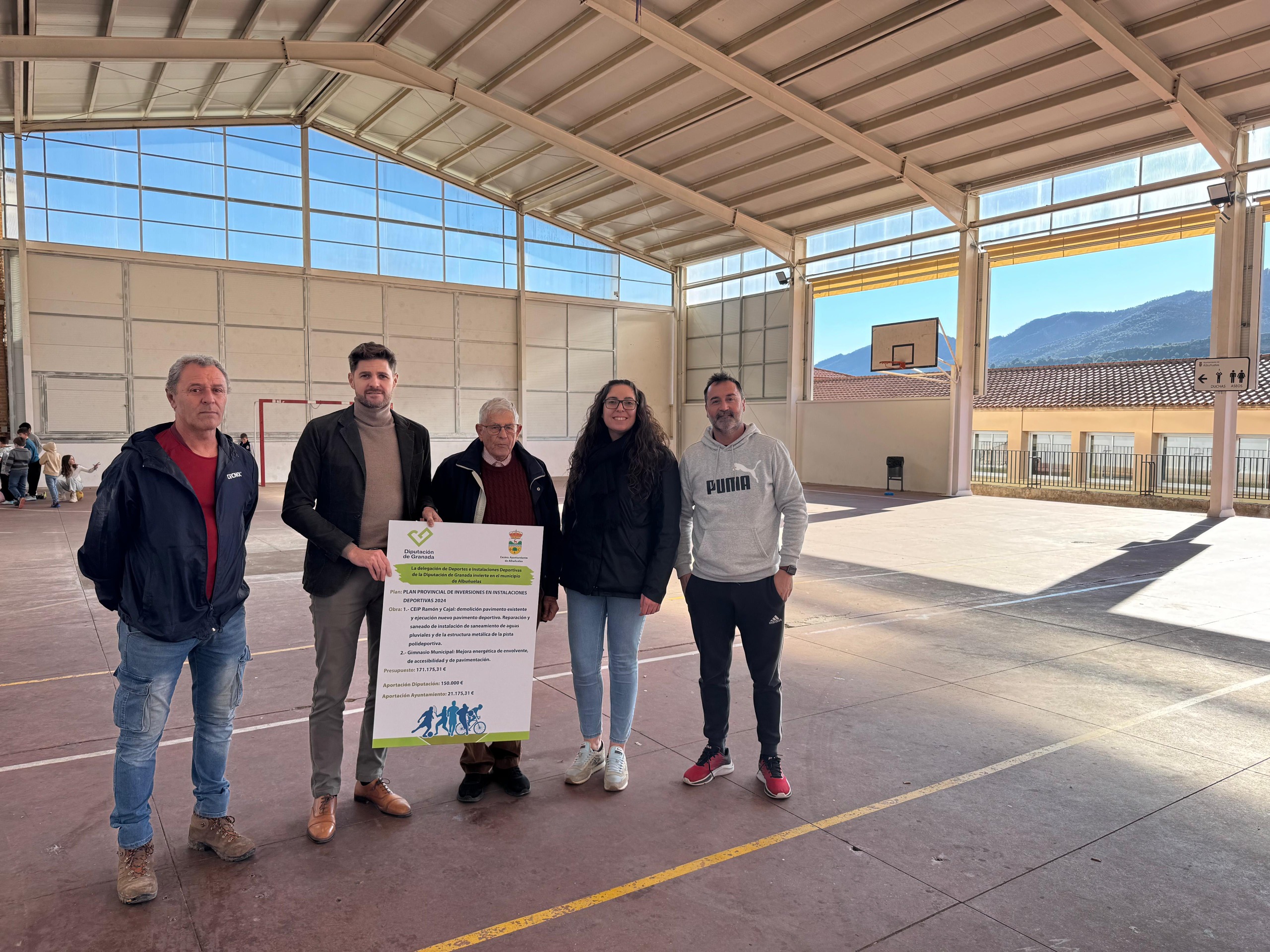 En Albuñuelas, se llevarán a cabo dos obras. Una en el CEIP Ramón y Cajal, donde se procederá a la demolición y renovación del pavimento de la pista polideportiva, además de la reparación del sistema de saneamiento de aguas pluviales y la estructura metálica de la pista polideportiva. Asimismo, se acometerán mejoras energéticas, de accesibilidad y pavimentación en el gimnasio municipal. El presupuesto total de estas actuaciones asciende a 171.175,31 euros, con una aportación de 150.000 euros por parte de la Diputación y 21.175,31 euros del ayuntamiento.